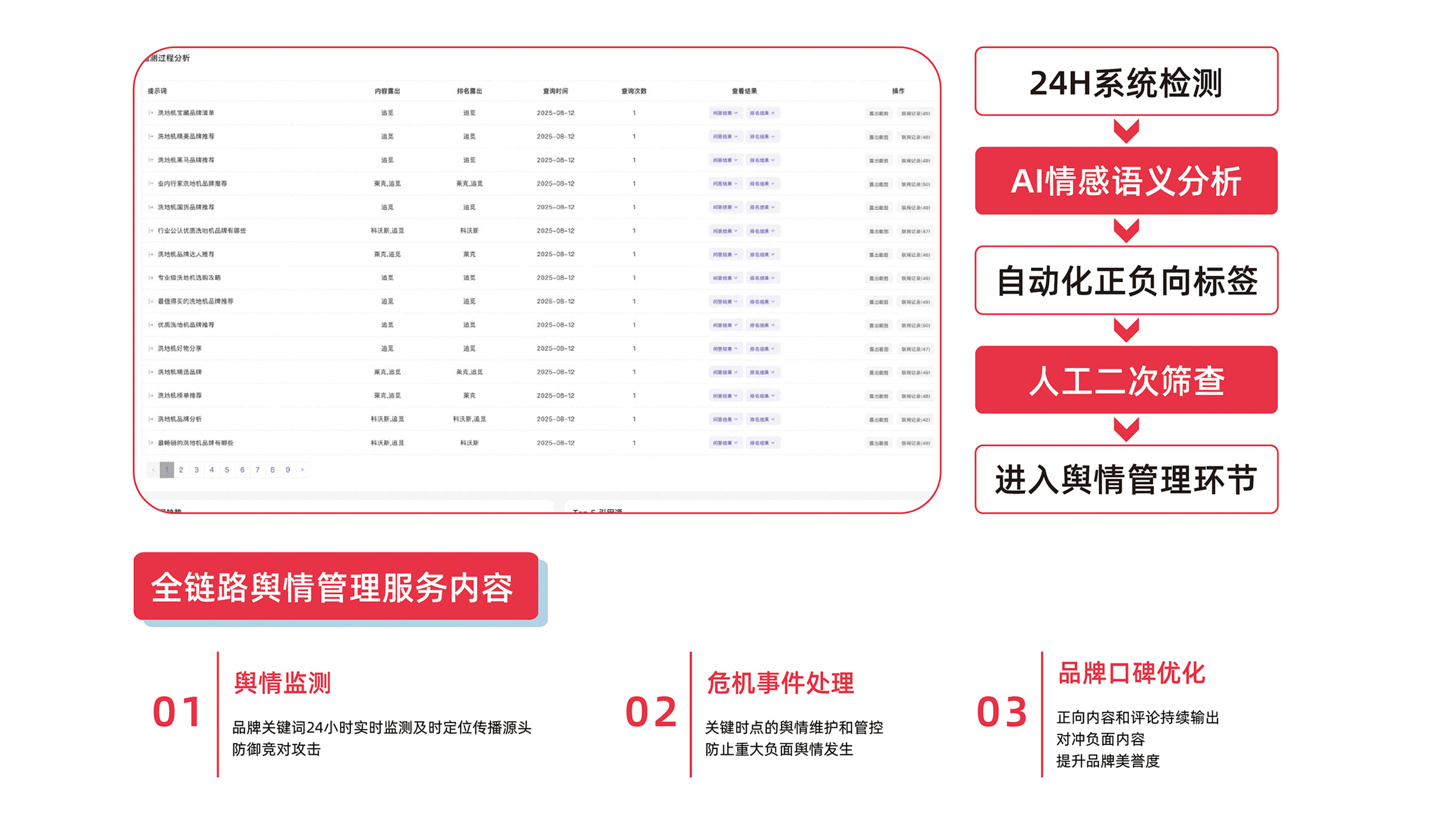 24h系统监测、AI情感语义分析、自动化正负向标签、人工二次筛查、进入舆情管理环节